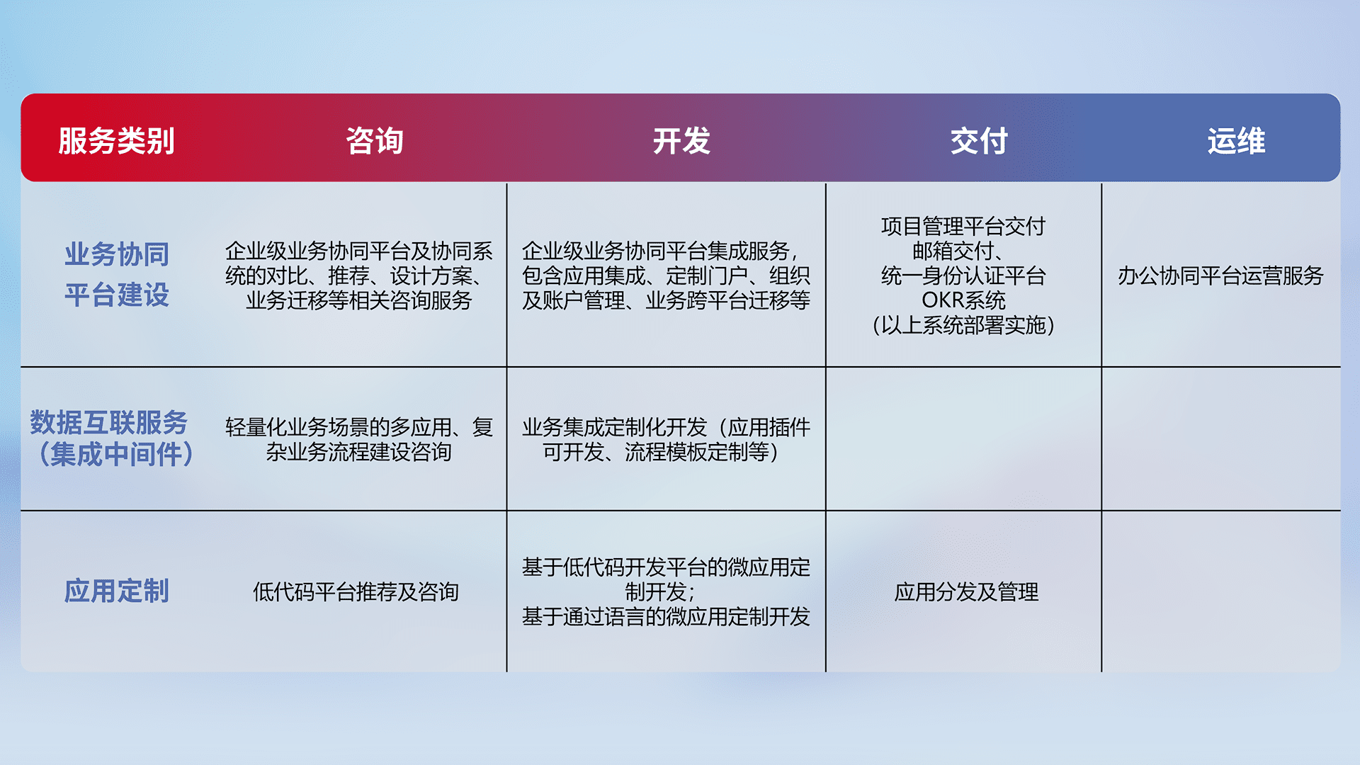 针对钉钉、、企微、、、IDaas等平台级产品提供产品的规划、、、、方案、、、、交付、、、、定制化开发等服务,,实现如统一协同办公、、、、智能客户服务、、、、混合会议管理、、、智能数据查询、、、等业务场景,,,,实现数字化转型。。。。